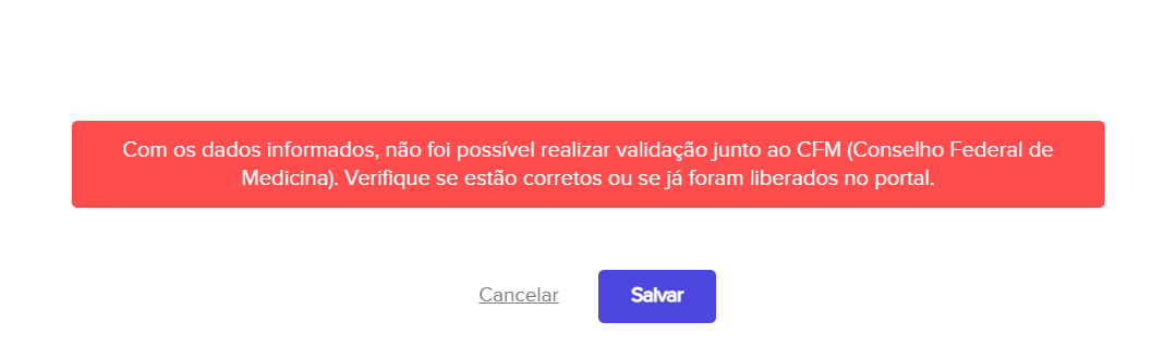 Ao tentar editar o CRM e os dados forem incorretor uma mensagem será exibida “Com os dados informados não foi possível realizar validação junto ao CFM (Conselho Federal de Medicina). Verifique se estão corretos ou se já foram liberados no portal."