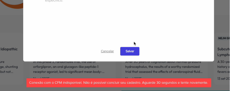 Ao tentar editar o CRM e ele já estar cadastrado na plataforma ao clicar em salvar uma mensagem “Conexão com CFM indisponivel. Não é possivel concluir seu cadastro. Aguarde 30 segundos e tente novamente.” será exibida na tela e a edição não será concluida.